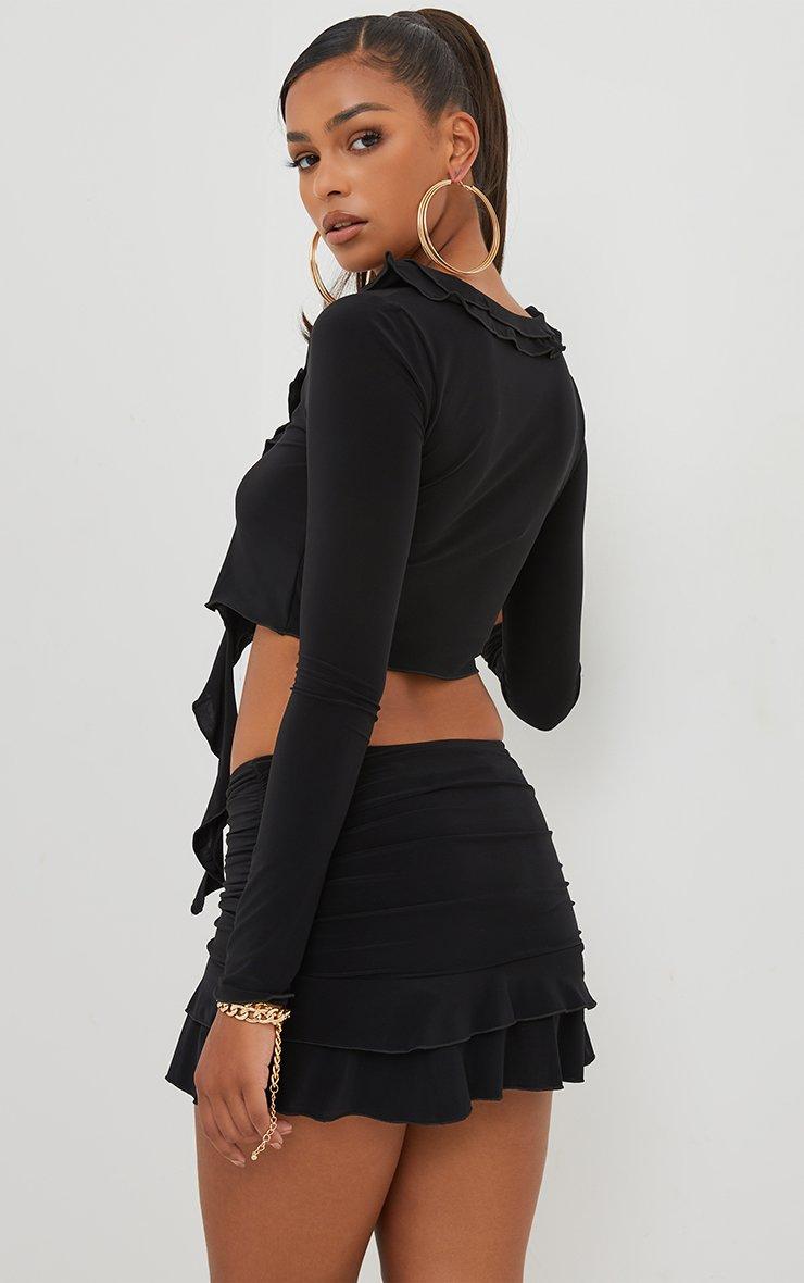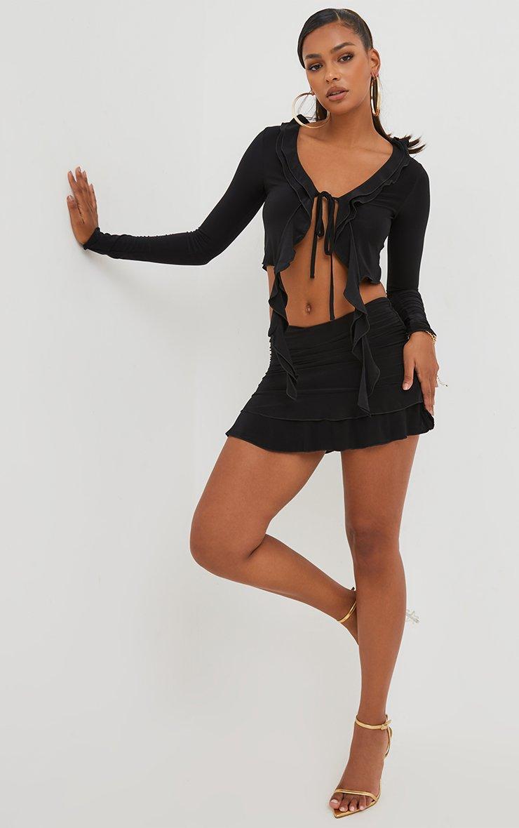 frill hem side ruched detail mini skirt in black slinky