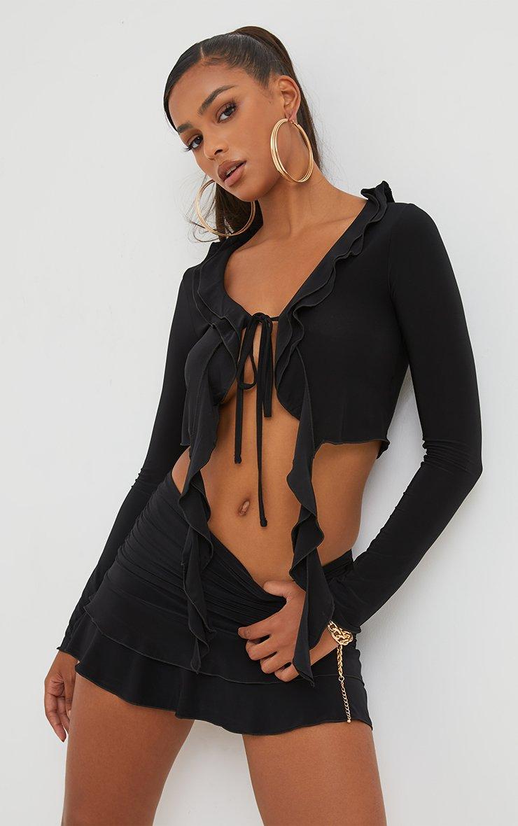 Mid Waist Asymmetric Frill Mini Skirt In Black Slinky