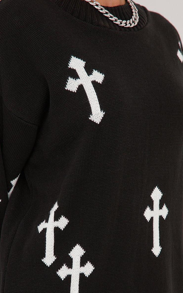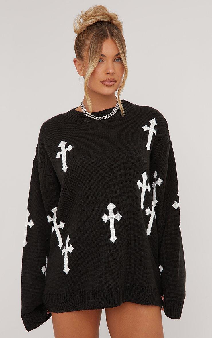 Long Sleeve Logo Detail Jumper In Black Stripe Fluffy Knit