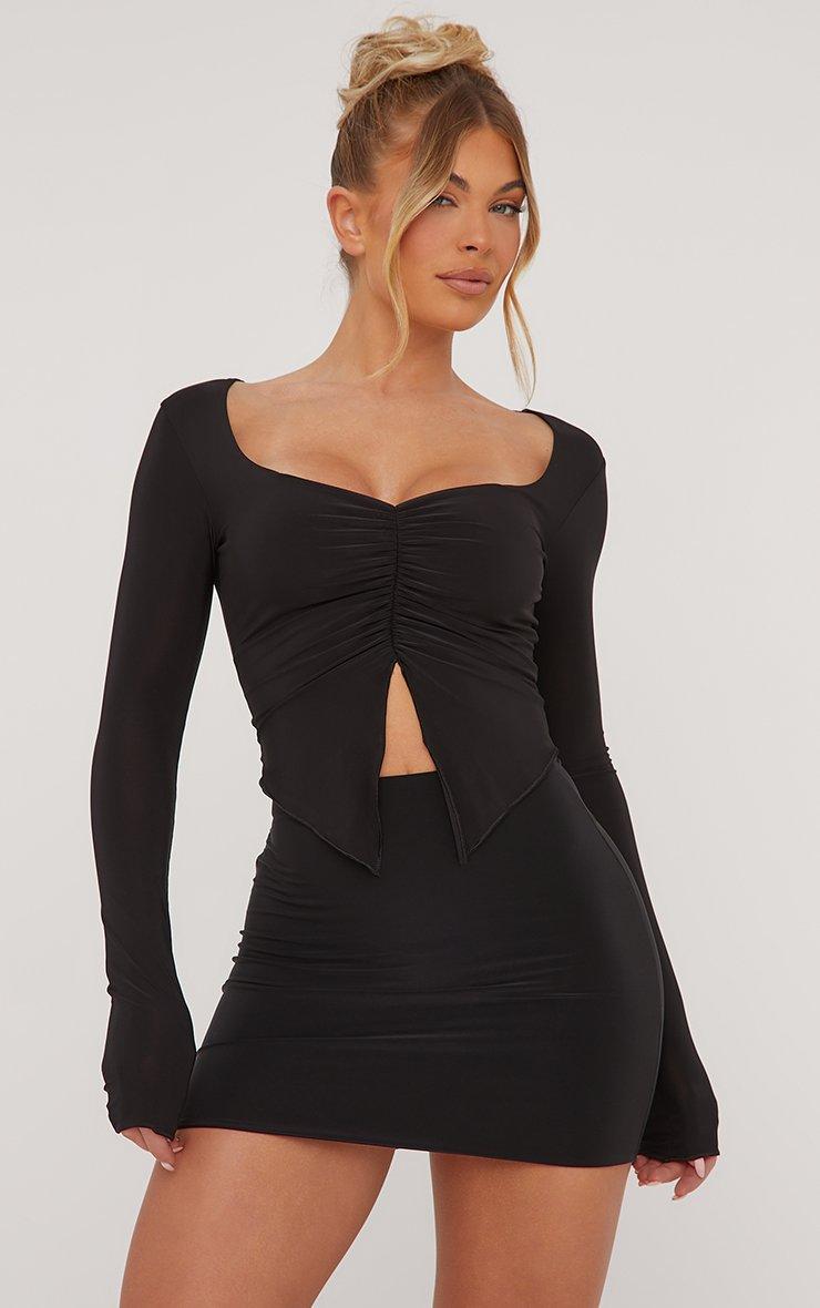 Low Rise Ruched Detail Mini Bodycon Skirt In Black Slinky