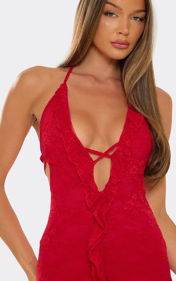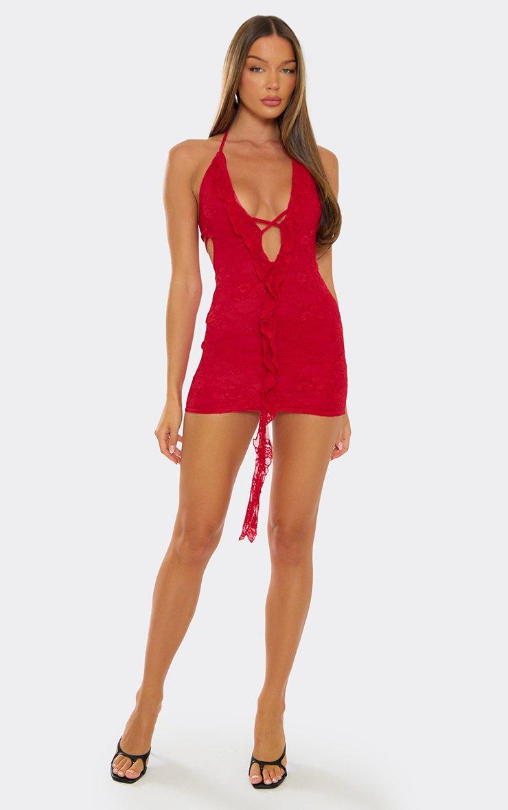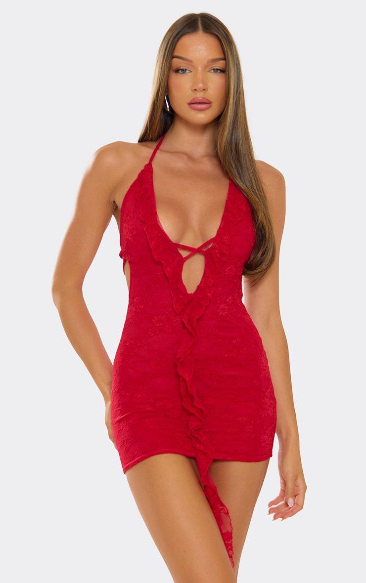 Plunge Halterneck Frill Detail Bodycon Mini Dress In Red