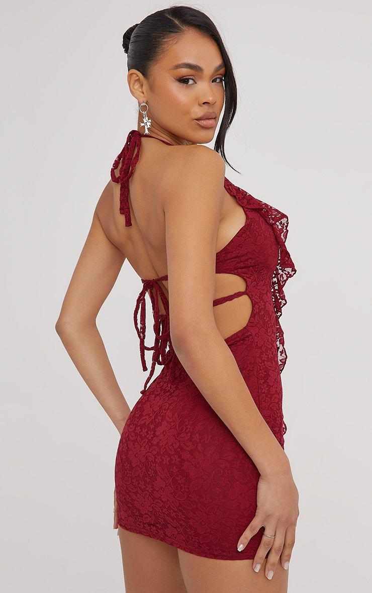Plunge Halterneck Frill Detail Mini Bodycon Dress In Burgundy Lace