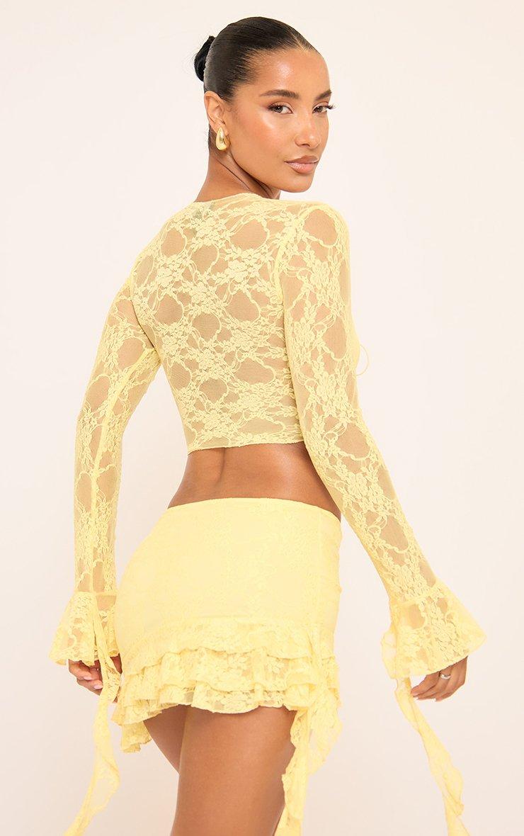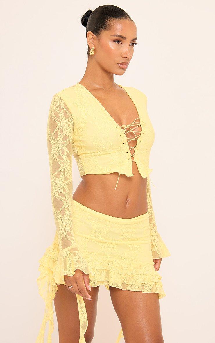 Long Sleeve Frill Detail Lace Up Front Crop Top In Yellow Lace