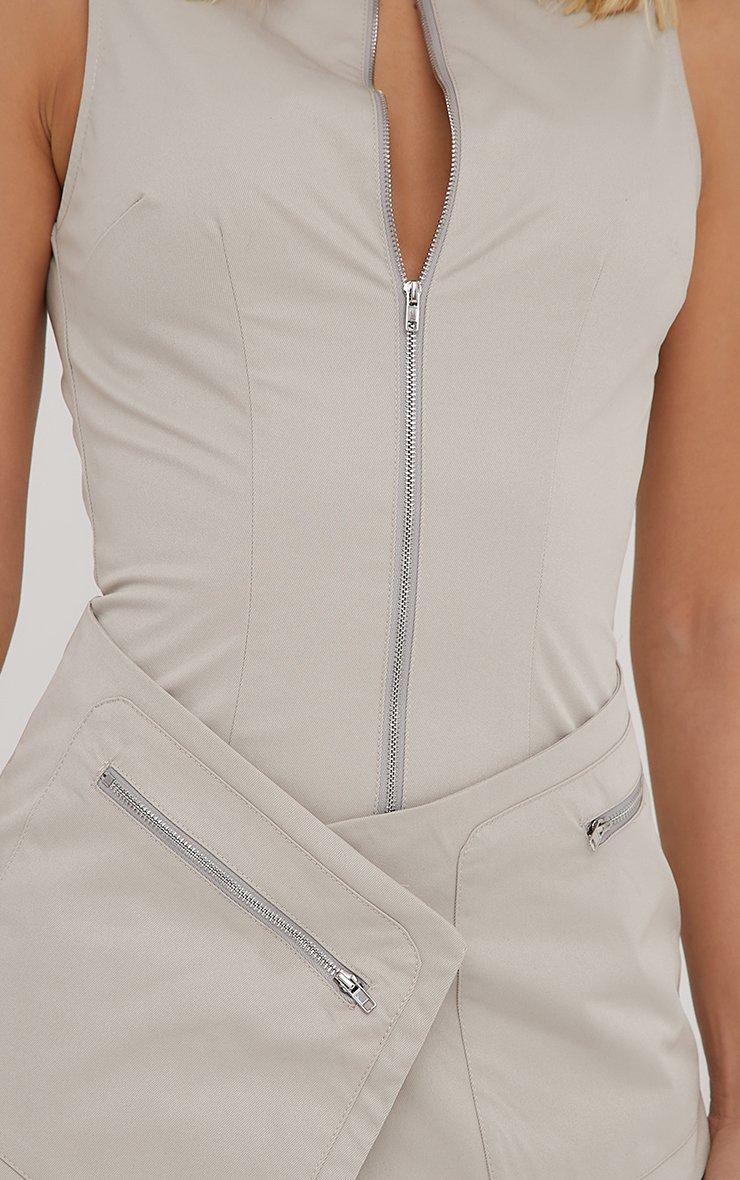 high neck zip front cross pocket detail cargo mini dress in stone woven