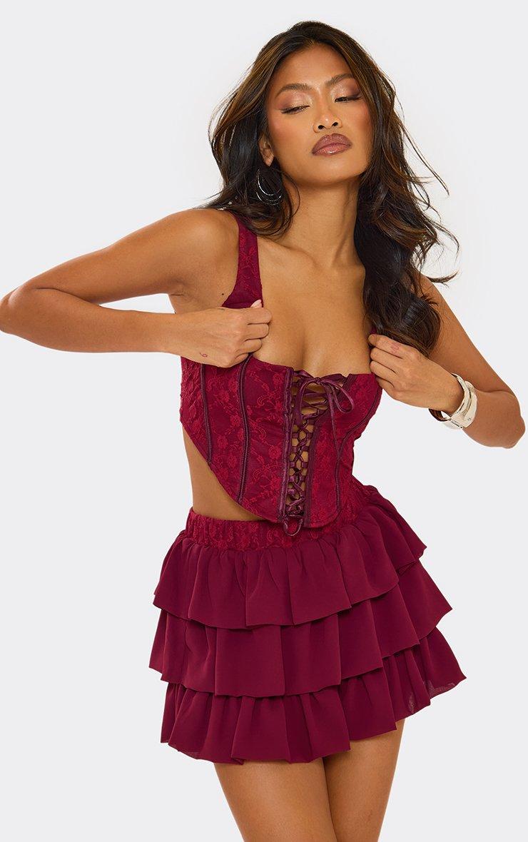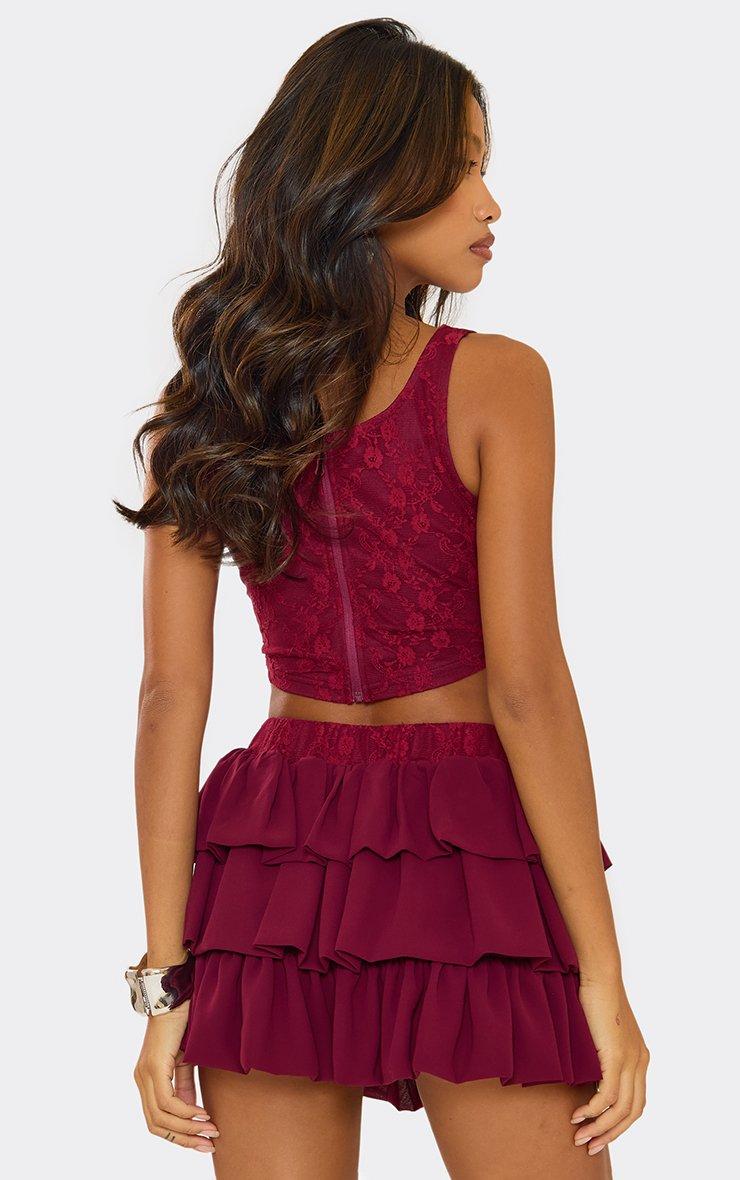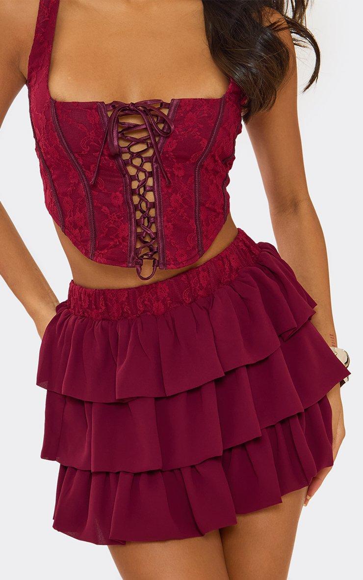 Low Rise Lace Waistband Pleated Mini Skirt In Burgundy