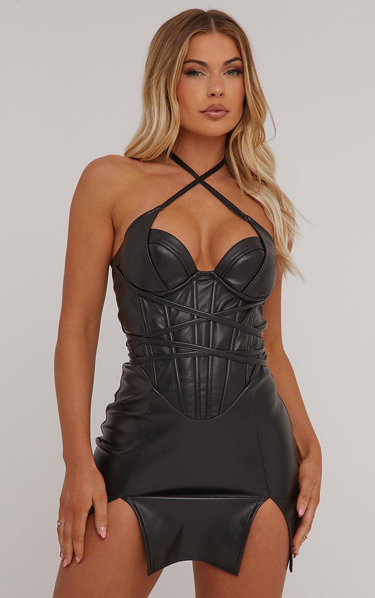 Cross Strap Detail Underwired Corseted Mini Dress In Black Faux Leather