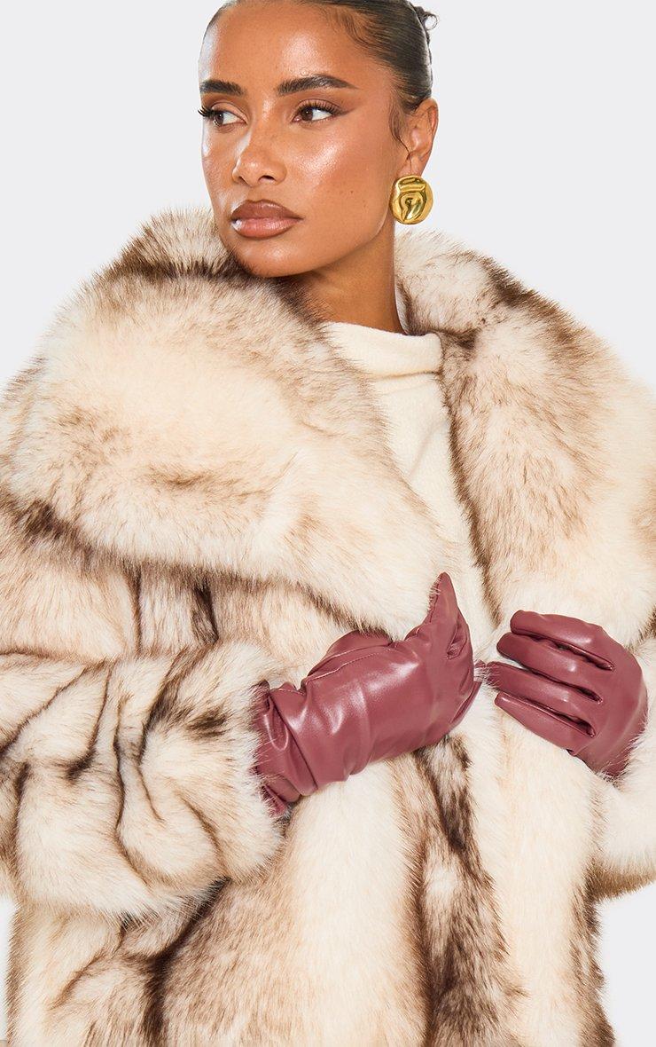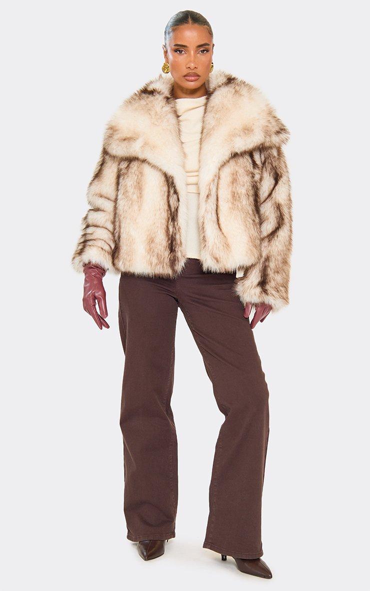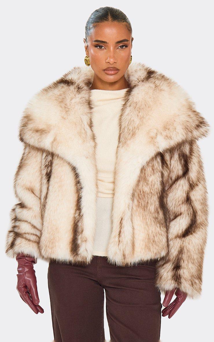 oversized collar detail cropped jacket in cream and brown stripe faux fur