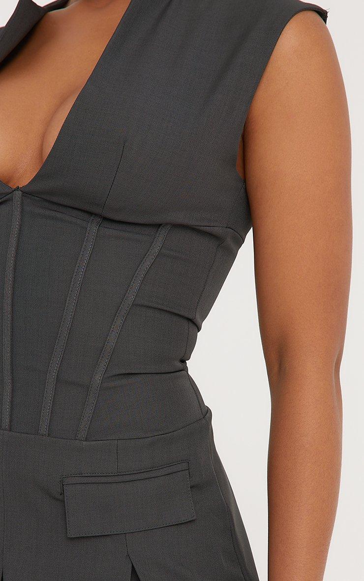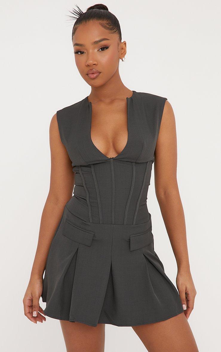 Plunge Neck Tailored Pleated Mini Dress In Grey
