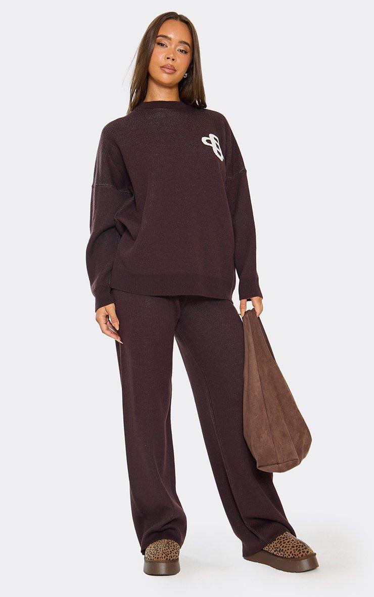 High Waist Embroidered Ego Logo Detail Wide Leg Trousers In Chocolate Brown Knit