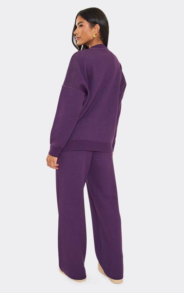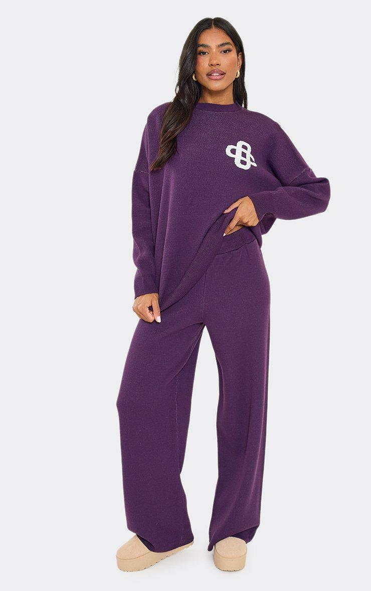 High Waist Contrast Swirl Detail Wide Leg Joggers In Plum Knit