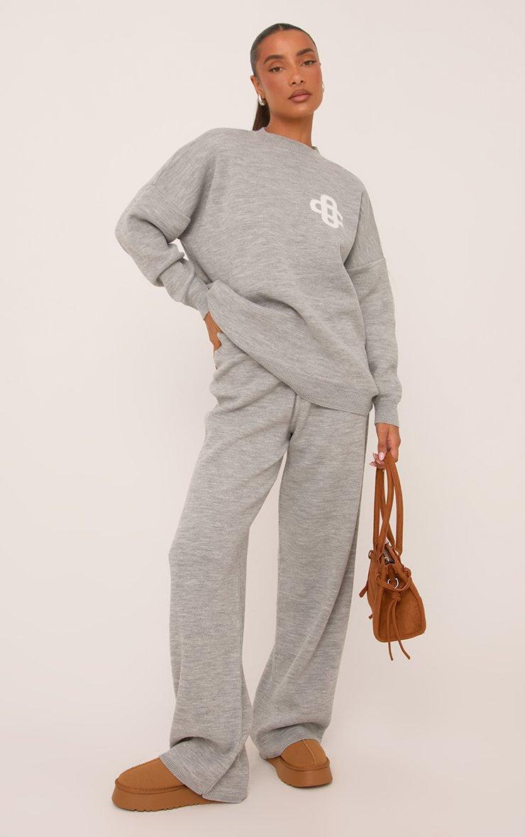 Mid Waist Ego Graphic Straight Leg Trousers In Grey Knit