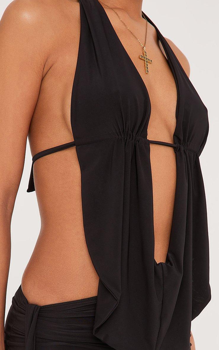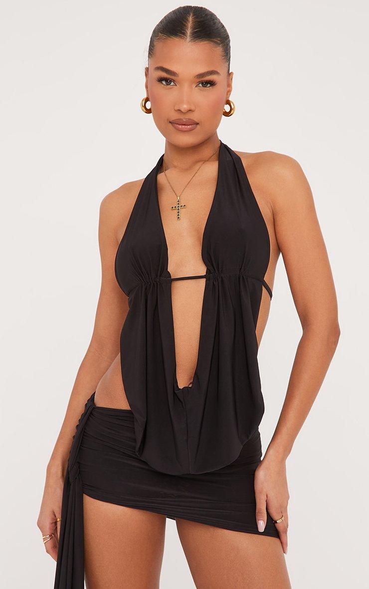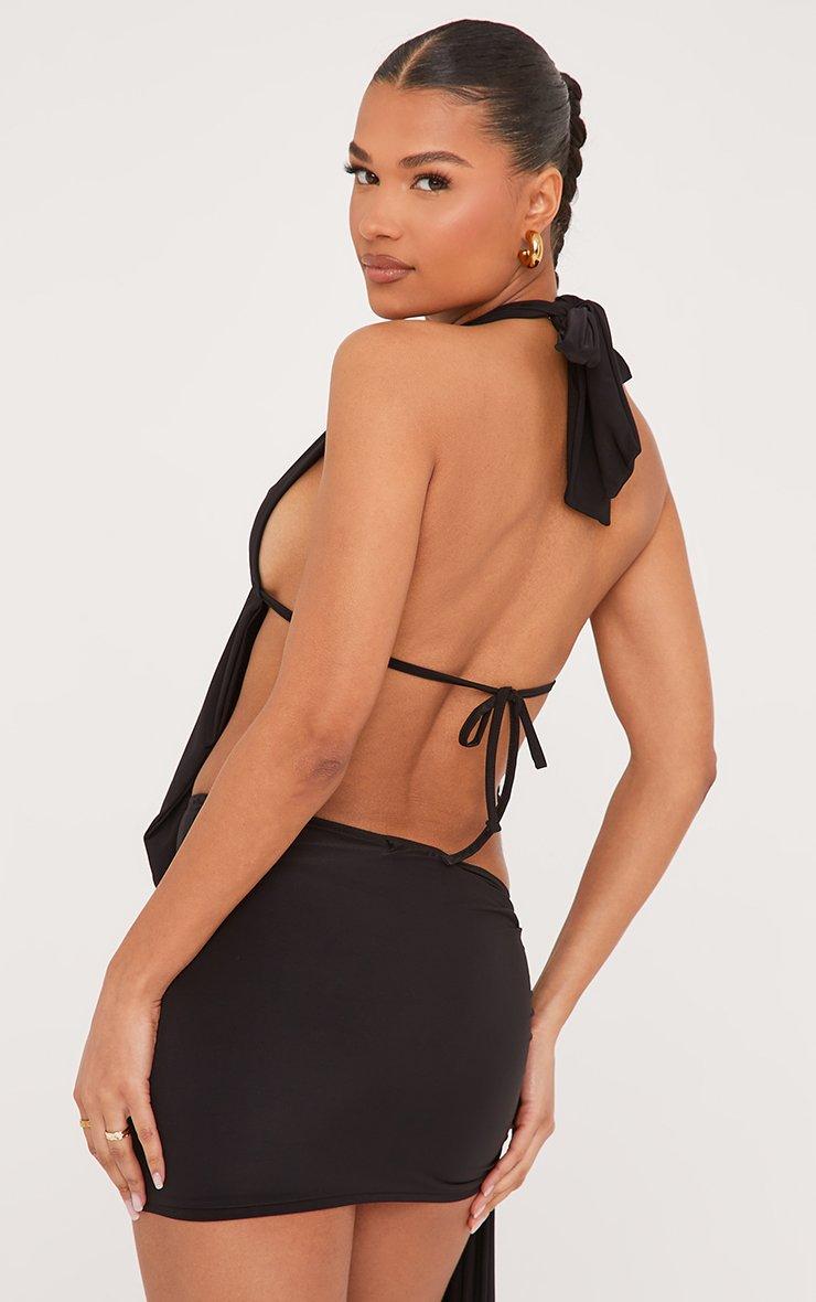 extreme cowl halterneck open back top and drape detail micro mini skirt co-ord set in black slinky