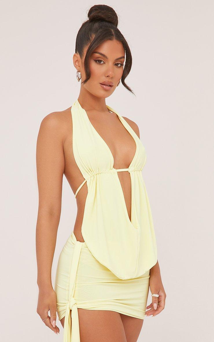 extreme cowl halterneck open back top and drape detail micro mini skirt co-ord set in pastel yellow slinky