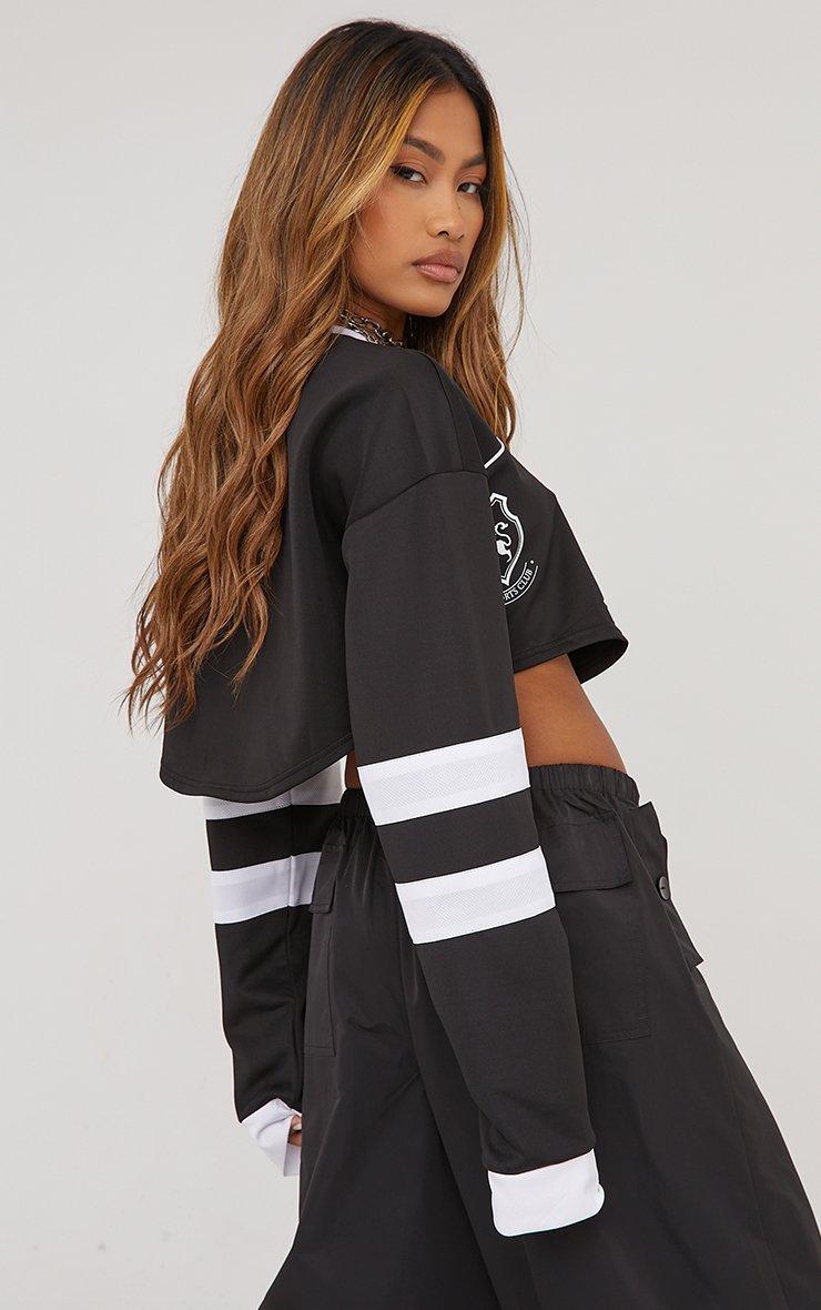 Long Sleeve Contrast Detail Curved Hem Football Top In Black