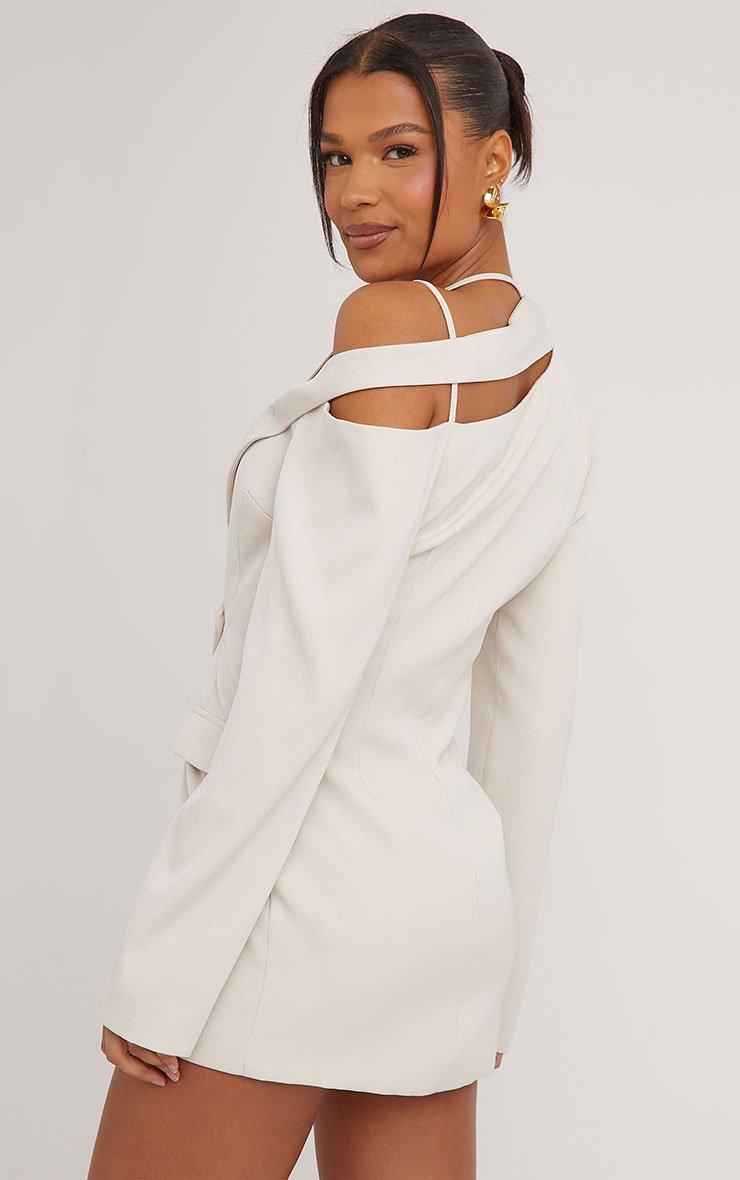 Oversized Shoulder Pad Cinched Waist Wool Look Blazer Dress In Stone