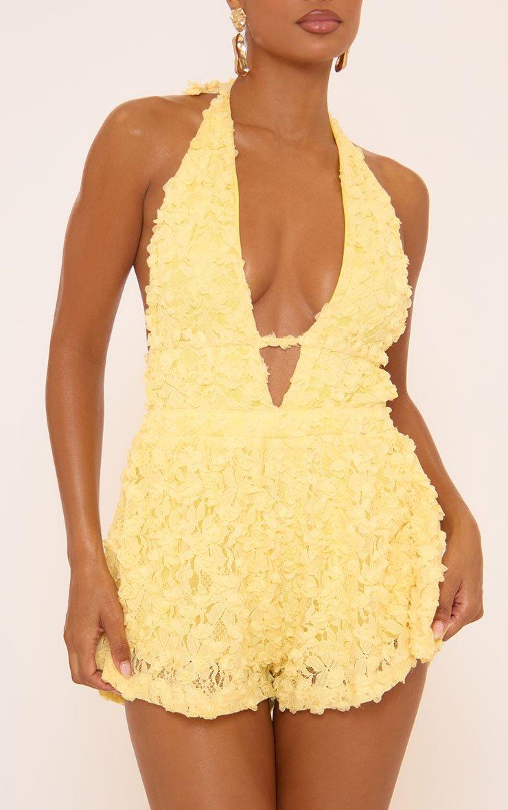 Fold Over Bardot Knot Detail Micro Playsuit In Yellow Lace