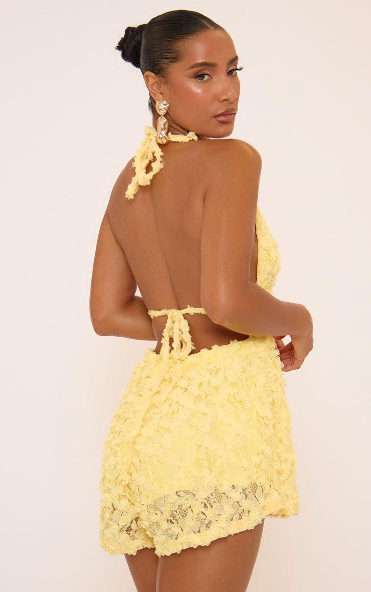 Halterneck Frill Detail Low Back Playsuit In Yellow Textured