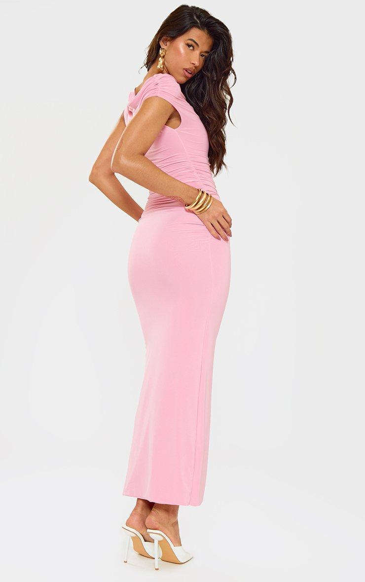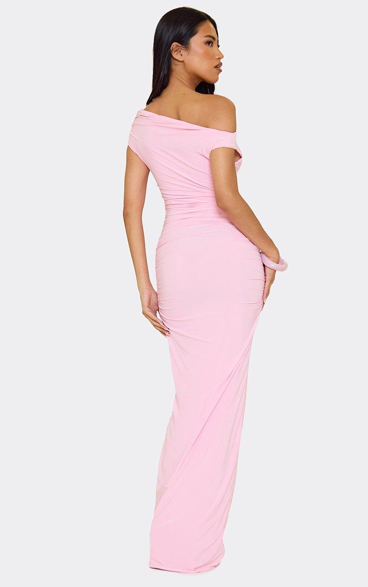 asymmetric one shoulder ruched detail maxi dress in pink slinky