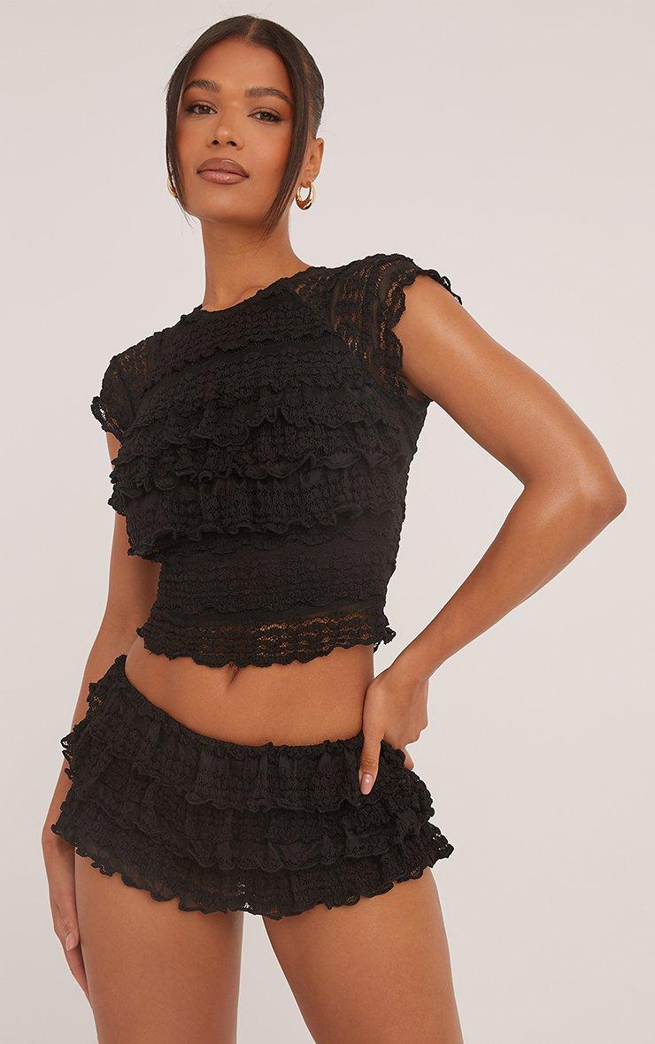 Low Rise All Over Frill Detail Booty Shorts In Black Texture