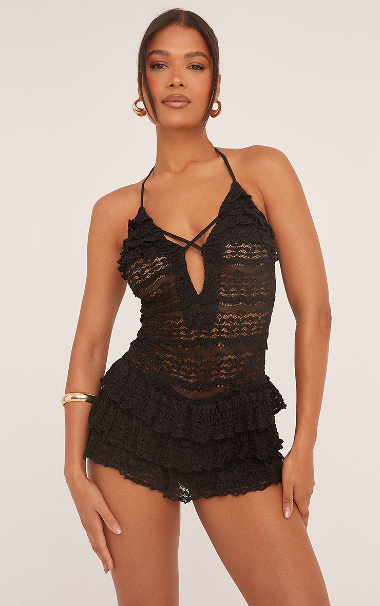 Halterneck Cross Strap All Over Frill Detail Playsuit In Black Texture