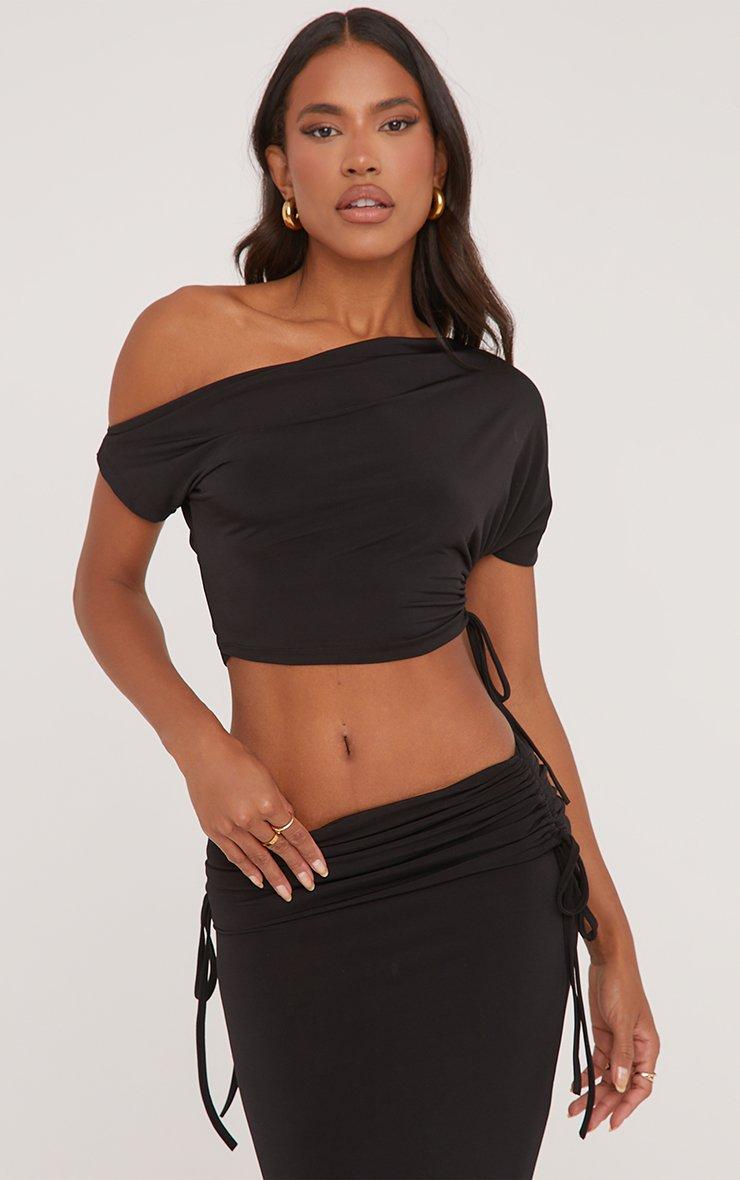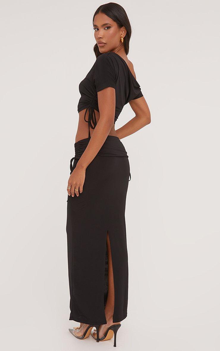 Ruched Detail Asymmetric One Shoulder Crop Top And Low Rise Maxi Skirt Co-Ord Set In Black Slinky