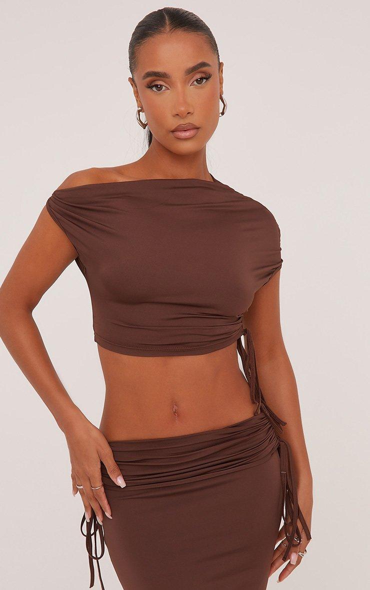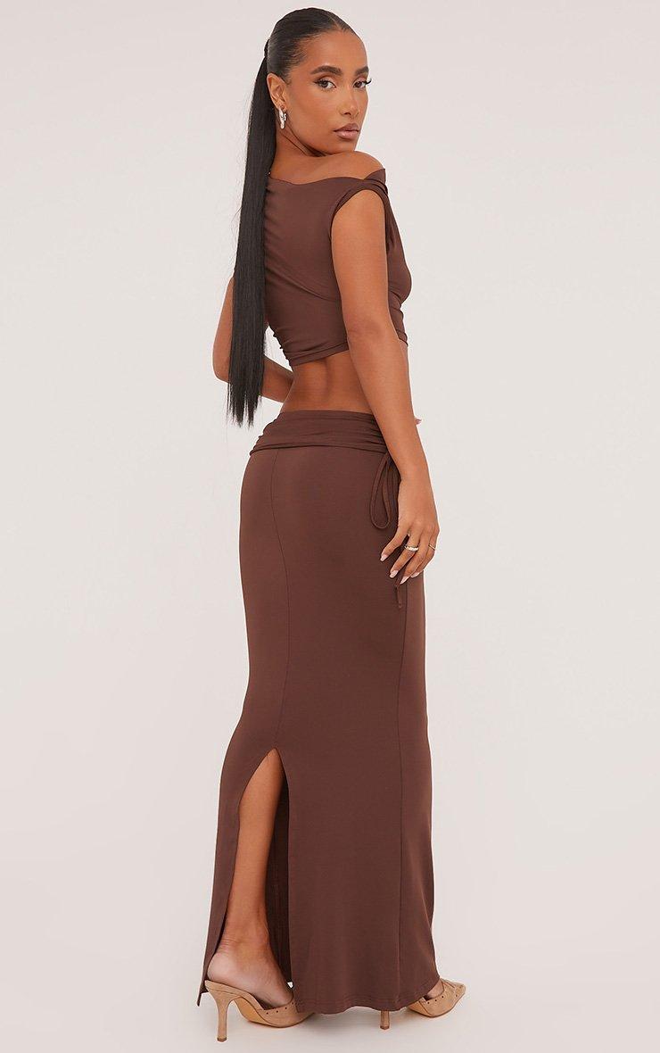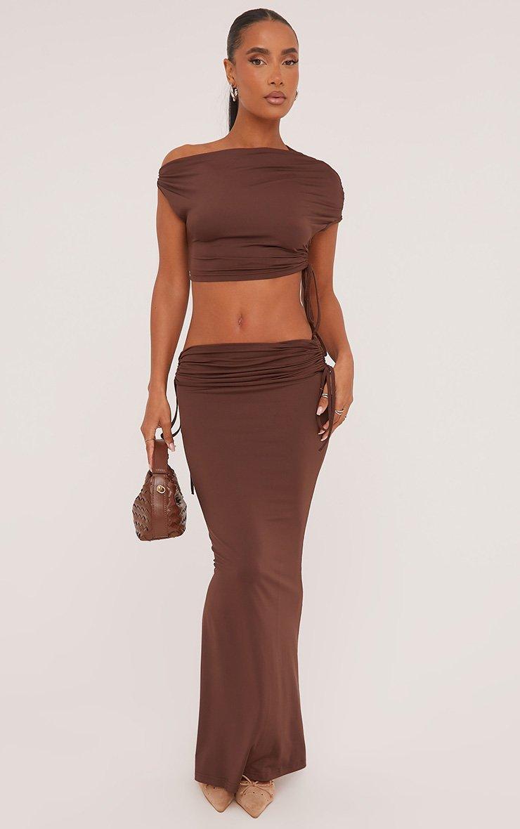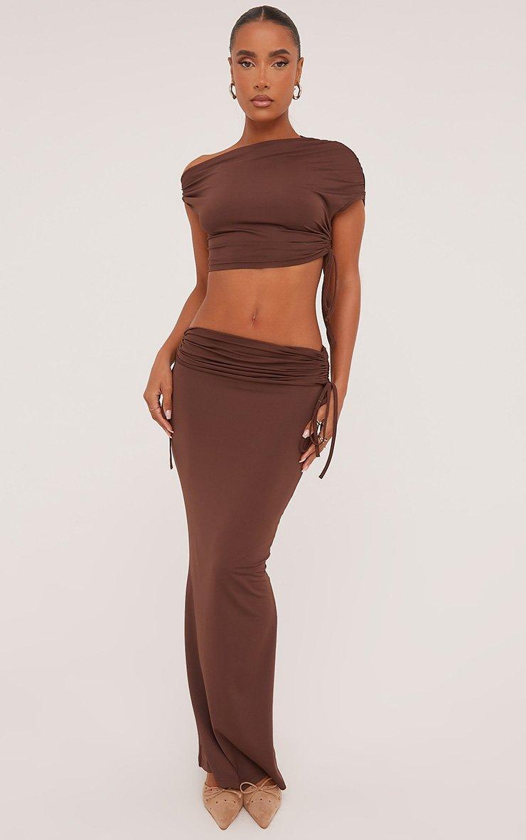 Ruched Detail Asymmetric One Shoulder Crop Top And Low Rise Maxi Skirt Co-Ord Set In Brown Slinky