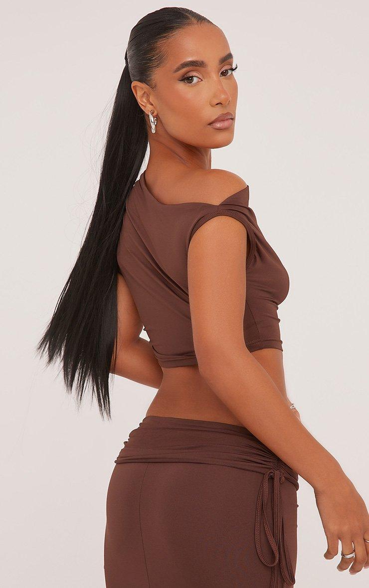 ruched detail asymmetric one shoulder crop top and low rise maxi skirt co-ord set in brown slinky