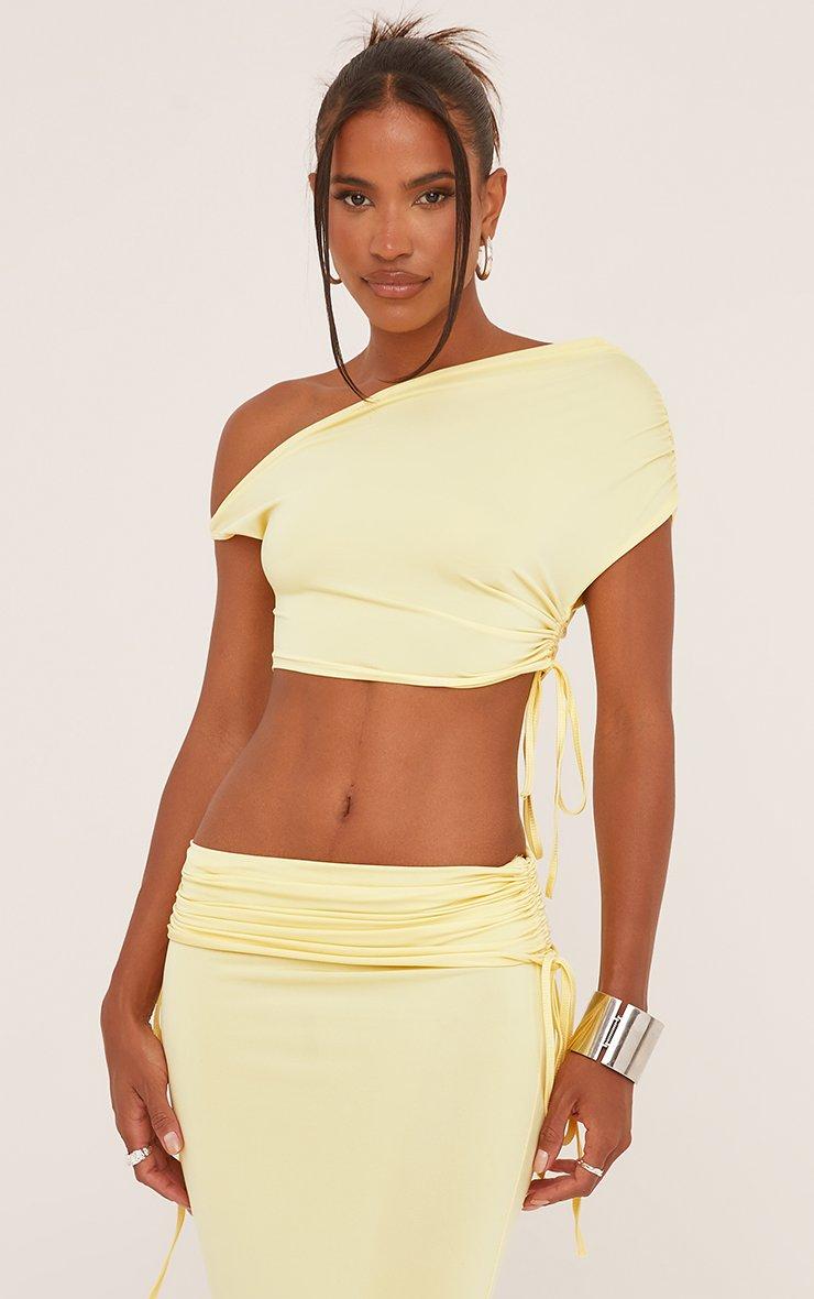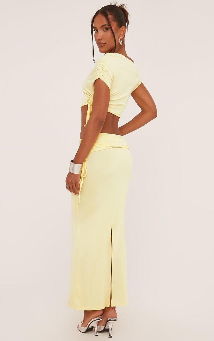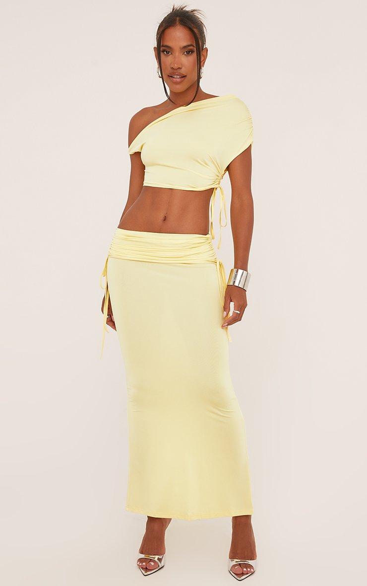 Ruched Detail Asymmetric One Shoulder Crop Top And Low Rise Maxi Skirt Co-Ord Set In Lemon Slinky