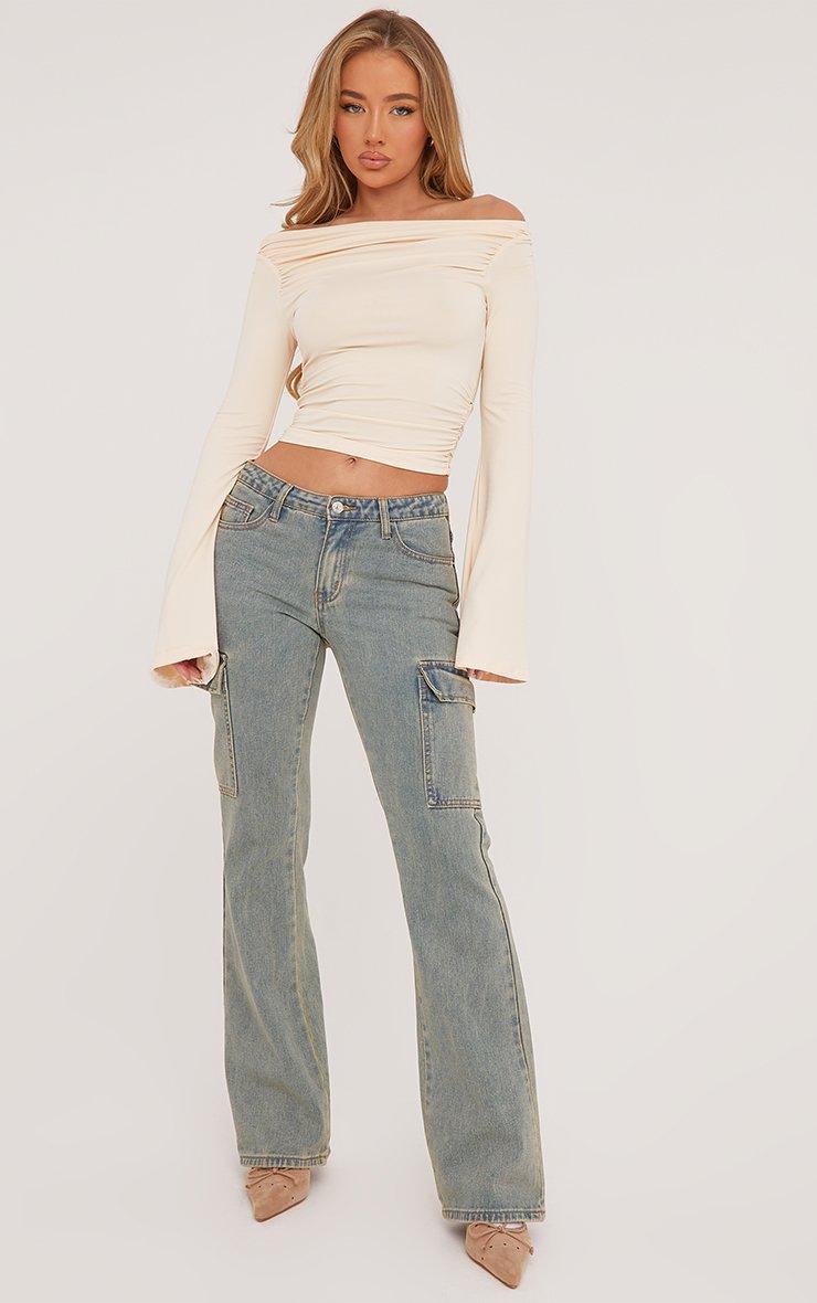 bardot flared sleeve top in cream slinky