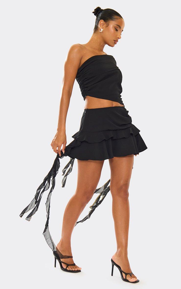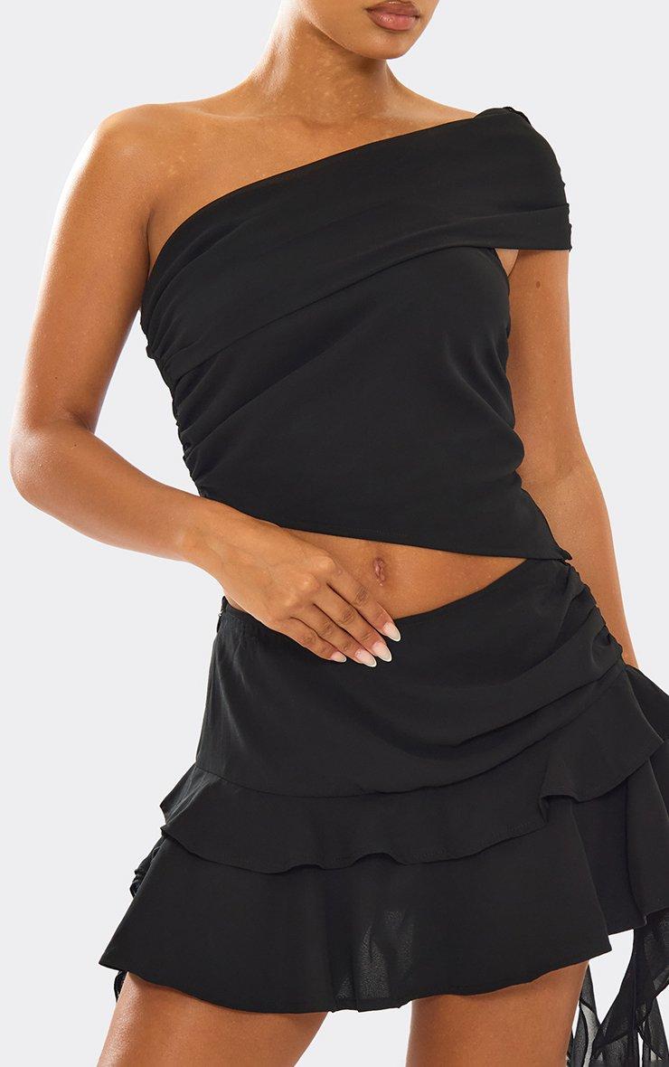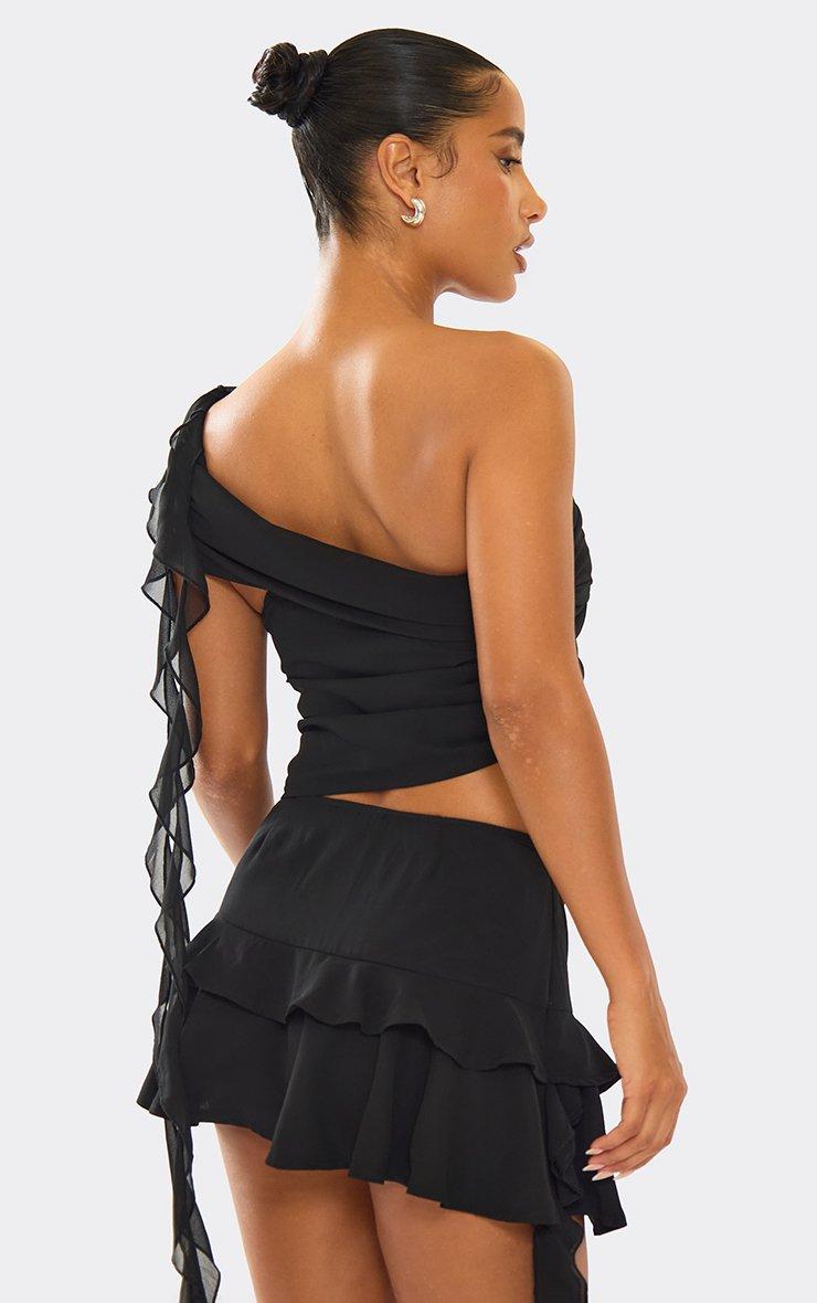 fold over asymmetric one shoulder frill detail crop top in black mesh