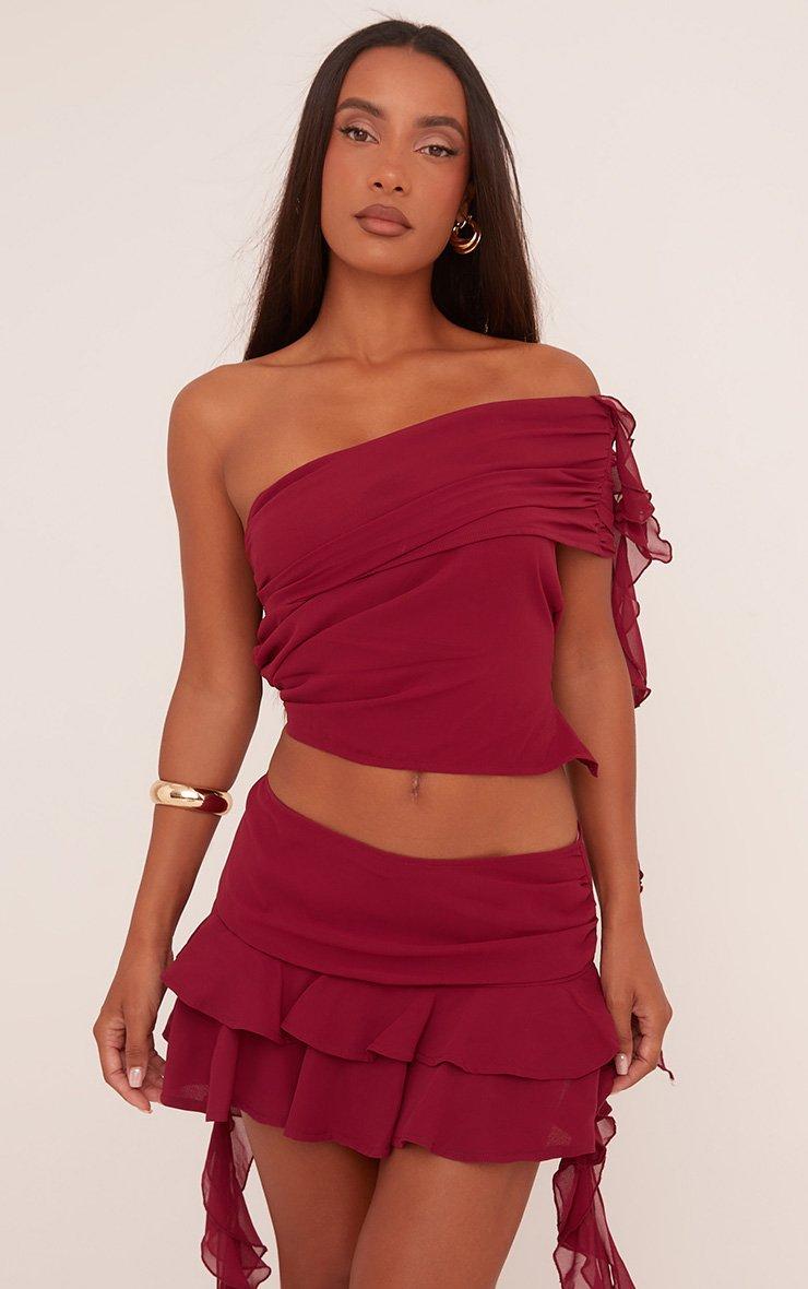 Mid Waist Twist Front Detail Mini Skirt In Burgundy Slinky
