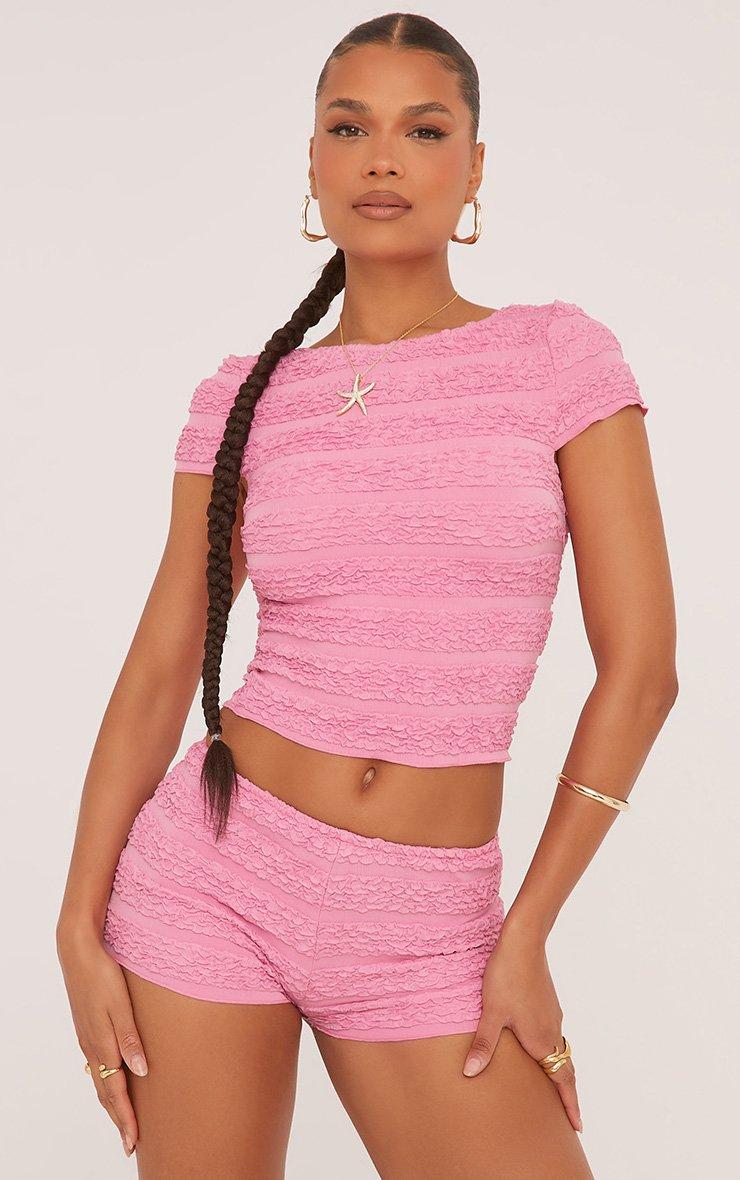 Low Rise All Over Frill Detail Booty Shorts In Pink Textured