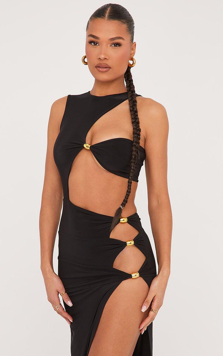 Extreme Cut Out Beaded Detail Split Leg Maxi Dress In Black
