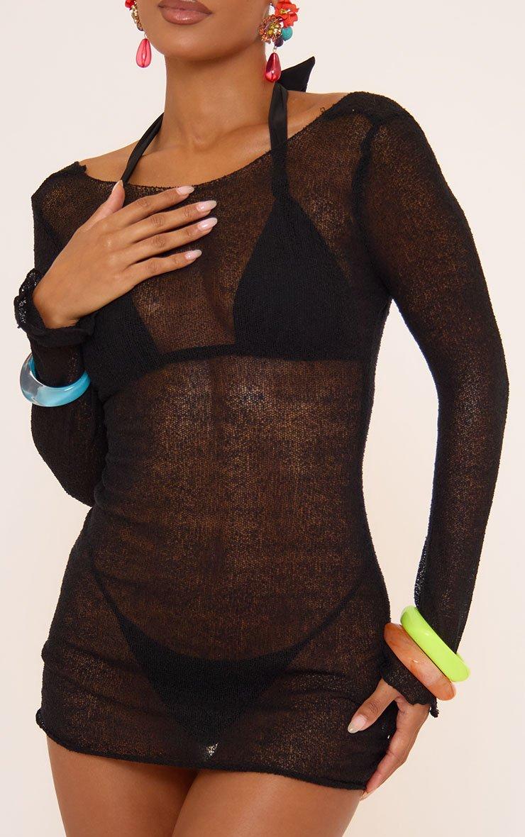 Long Sleeve Open Back Mini Beach Dress In Black Texture