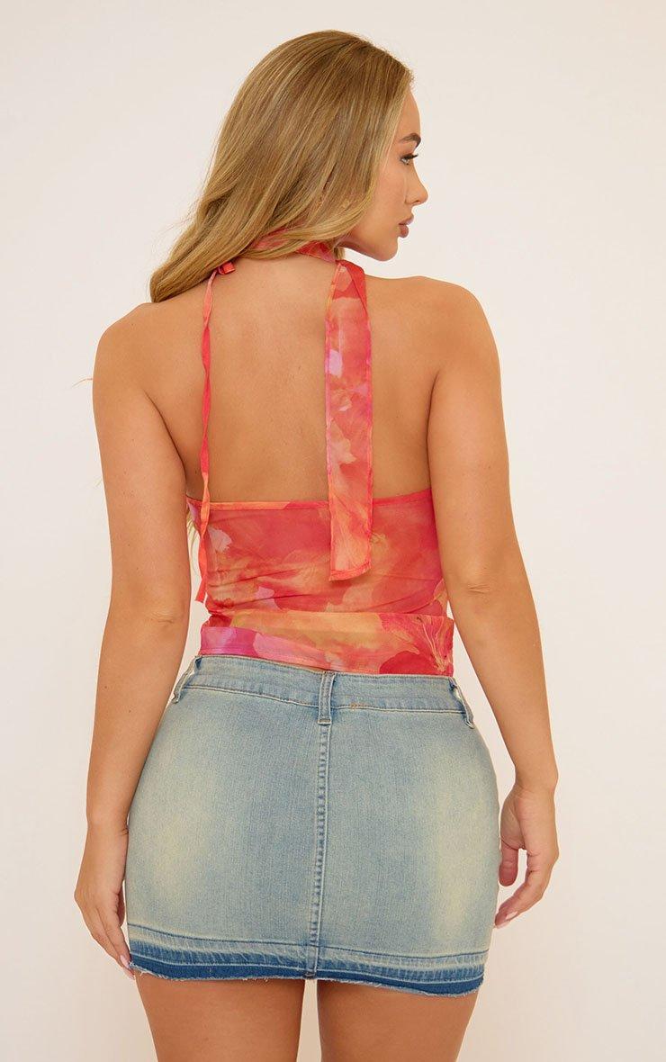 plunge front choker detail frilly top in orange printed mesh