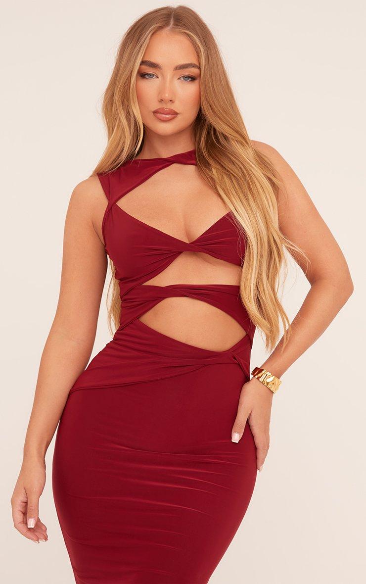Sleeveless Cut Out Twist Front Detail Maxi Dress In Wine