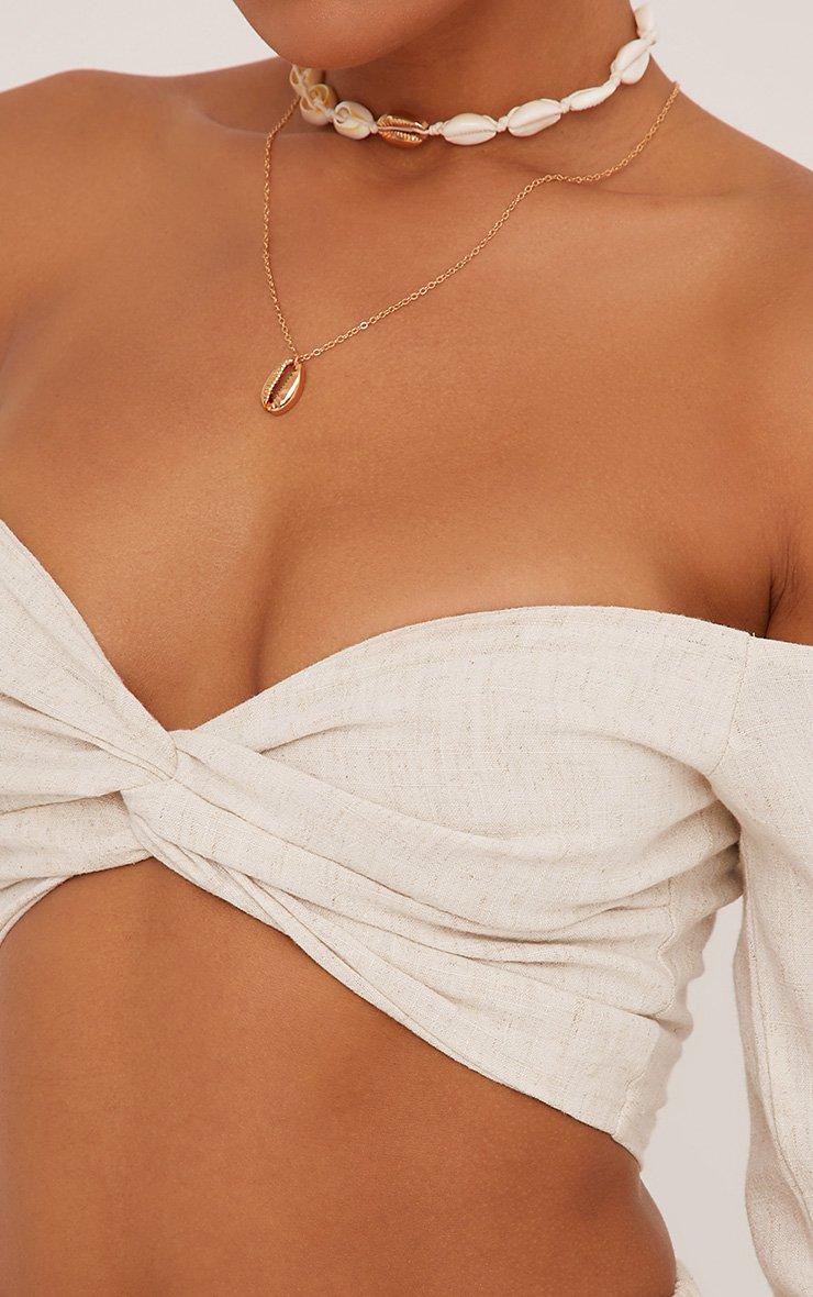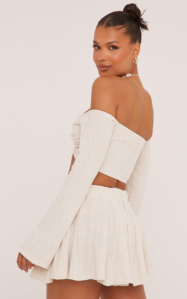 Flared Sleeve Bardot Knot Front Crop Top In Stone Linen