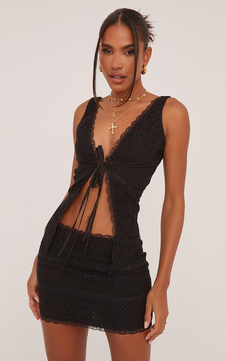 Mid Rise Lace Edge Mini Bodycon Broderie Skirt In Black