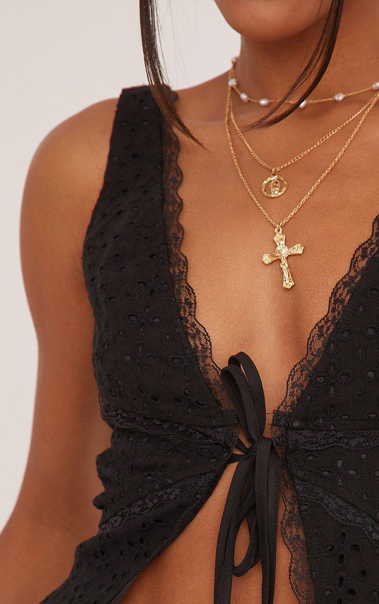 Plunge Tie Front Lace Edge Broderie Top In Black