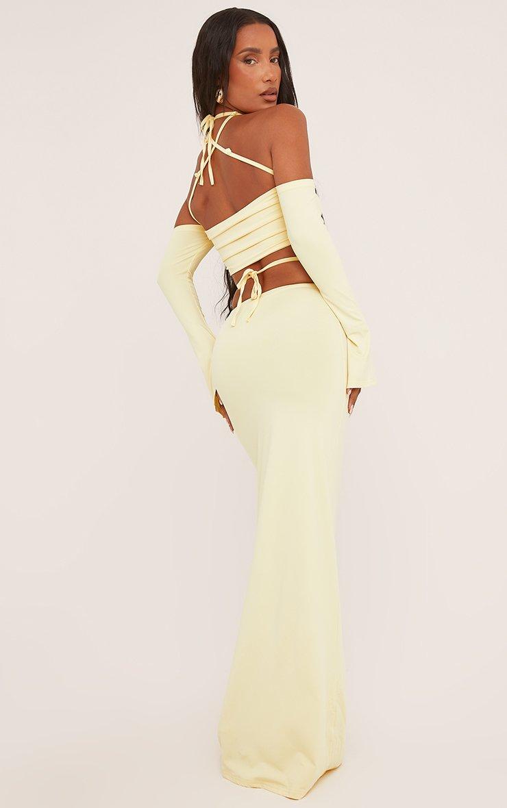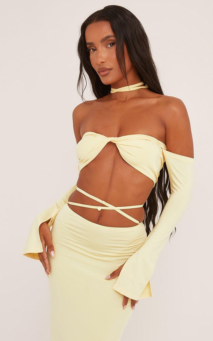 Rose Strap Detail Bardot Crop Top And High Waist Maxi Skirt Co-Ord Set In Lemon
