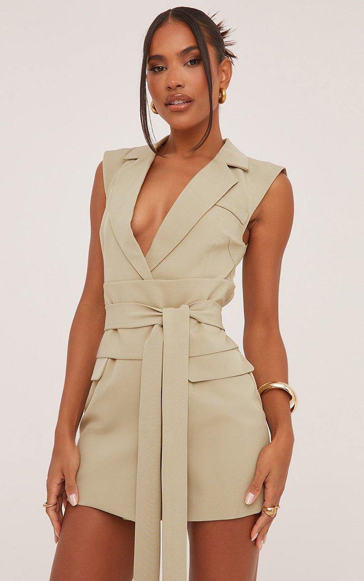 High Neck Drape Detail Structured Mini Dress In Khaki.