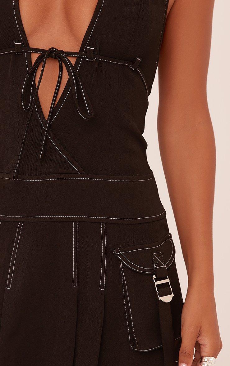 Plunge Tie Front Contrast Seam Mini Cargo Dress In Black Woven