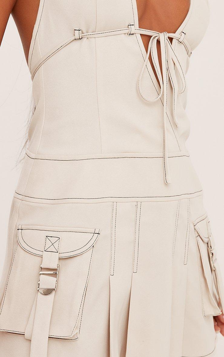 Scoop Neck Underwired Tie Front Pleated Cargo Mini Dress In Stone Woven