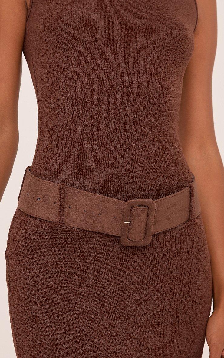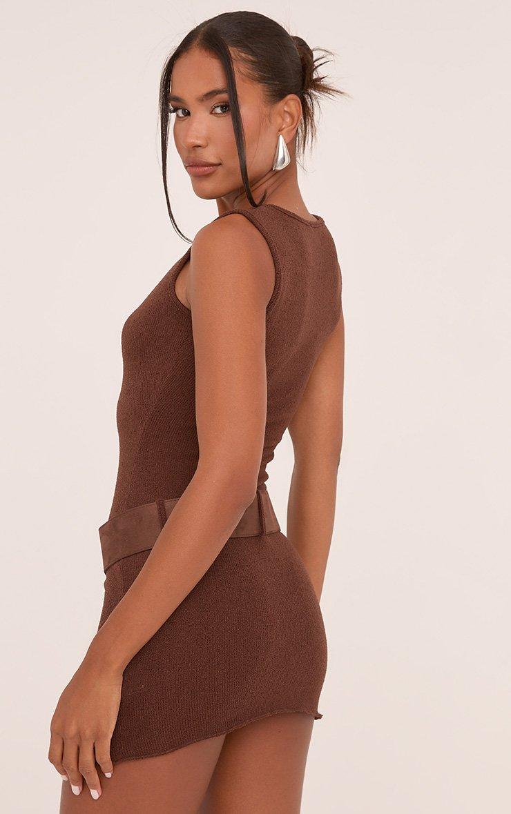 Sleeveless High Neck Belted Mini Bodycon Dress In Brown Woven