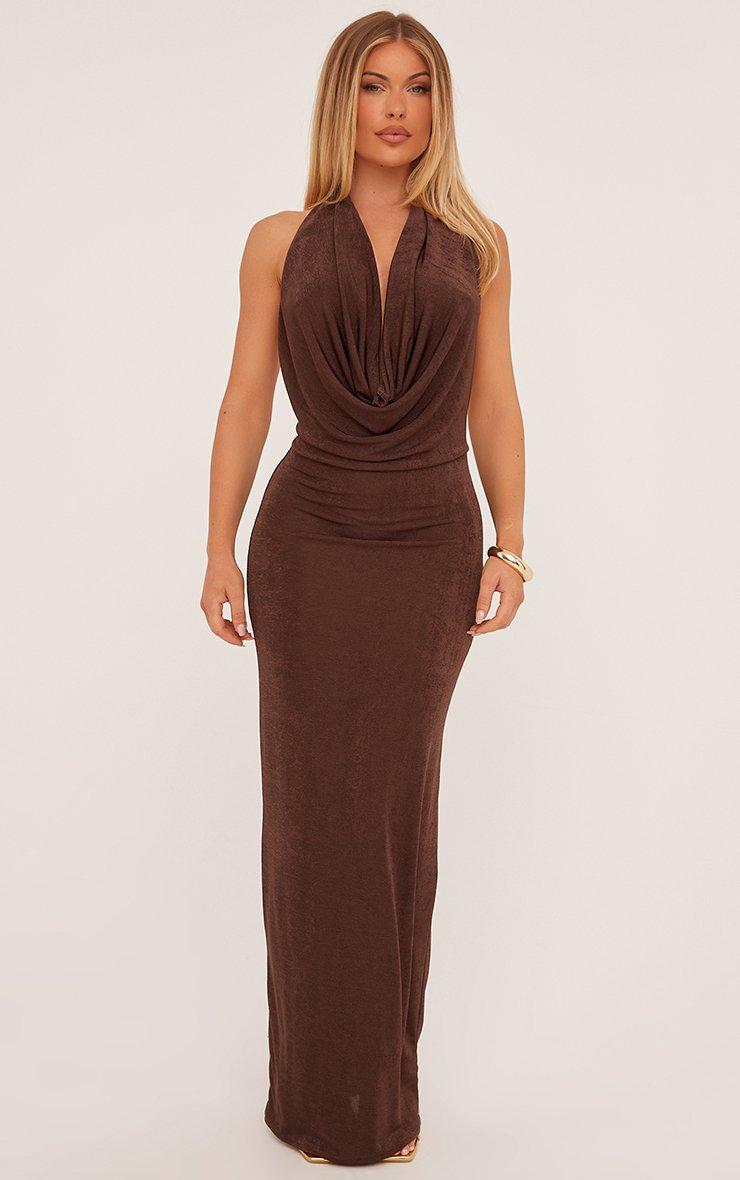 Extreme Cowl Flared Sleeve Mini Dress In Brown Slinky