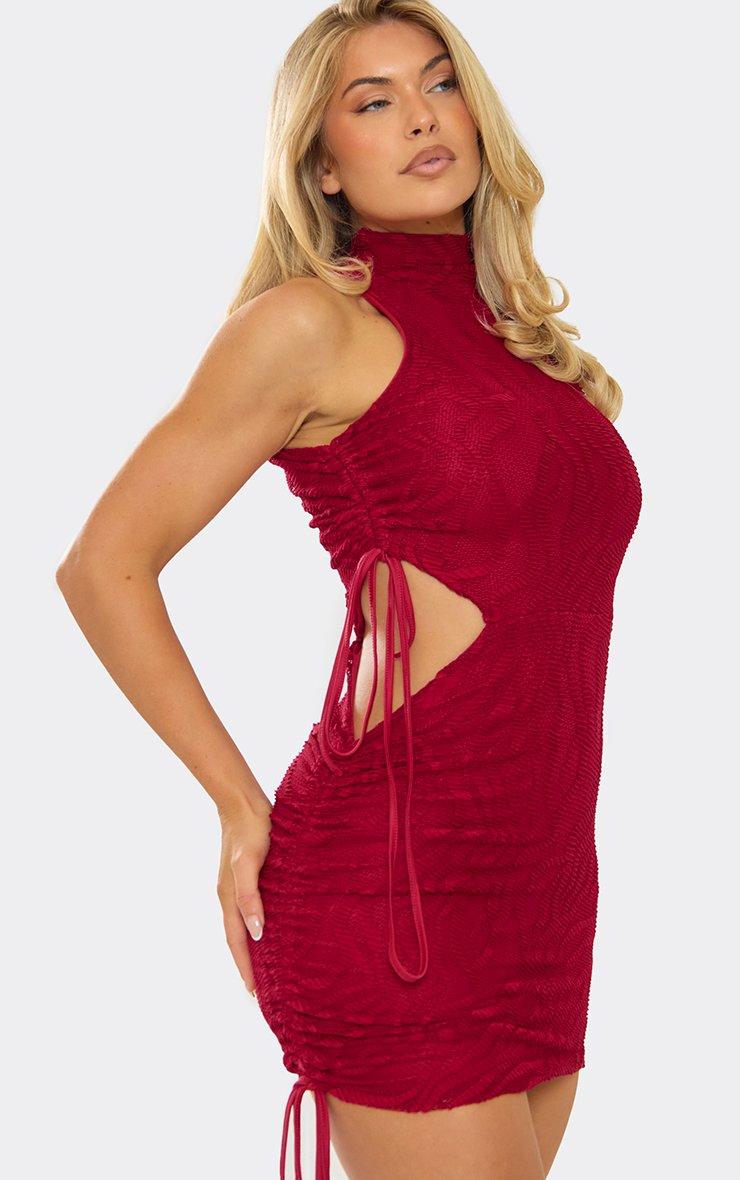 High Neck Cut Out Side Mini Bodycon Dress In Burgundy Red Texture