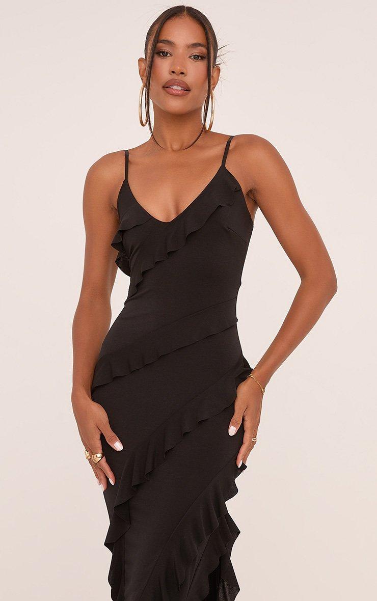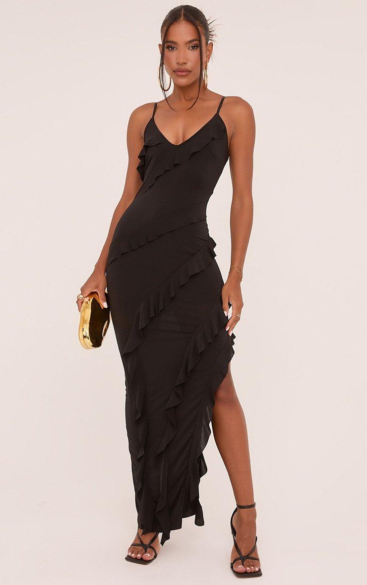 Strappy Tiered Frill Asymmetric Maxi Dress In Black Slinky