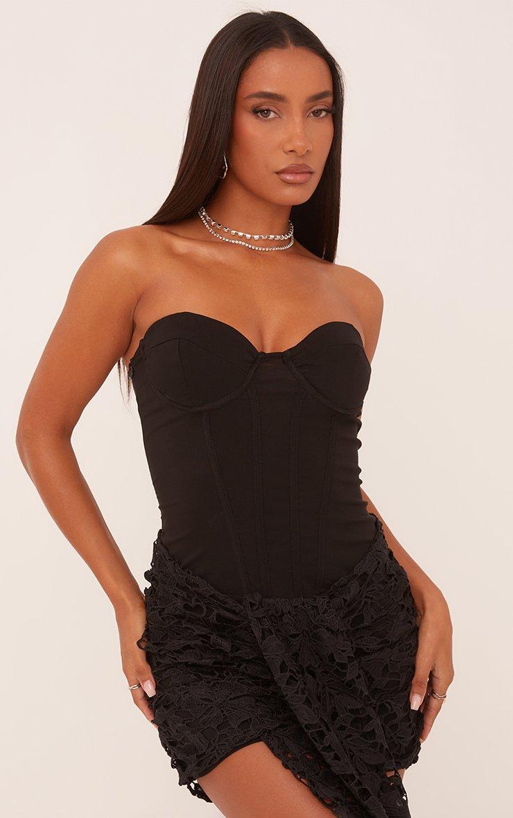 Bandeau Corseted Drape Detail Mini Bodycon Dress In In Black Textured Lace