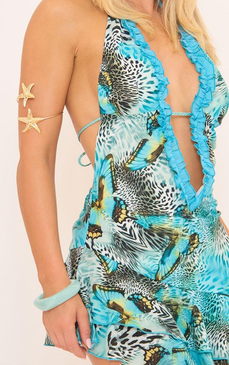 Halterneck Cross Over Detail Cut Out Mini Dress In Blue Animal Print