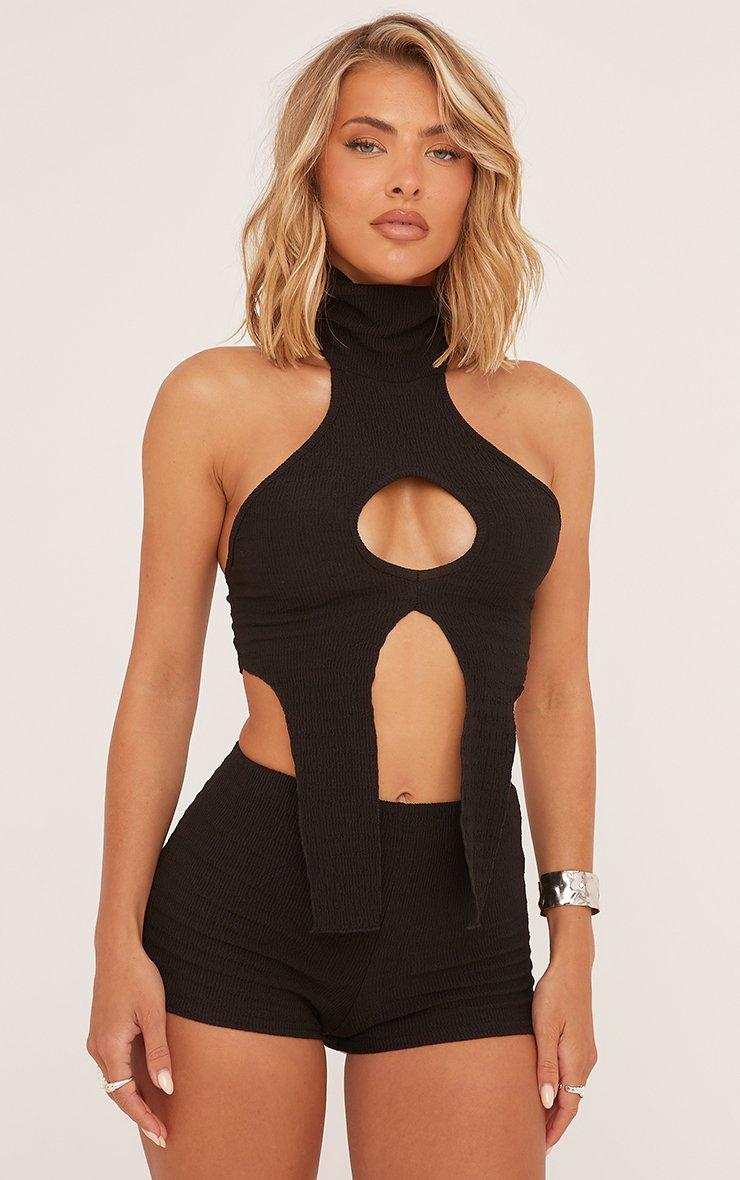 Fold Over Waist Distressed Booty Shorts In Black Texture